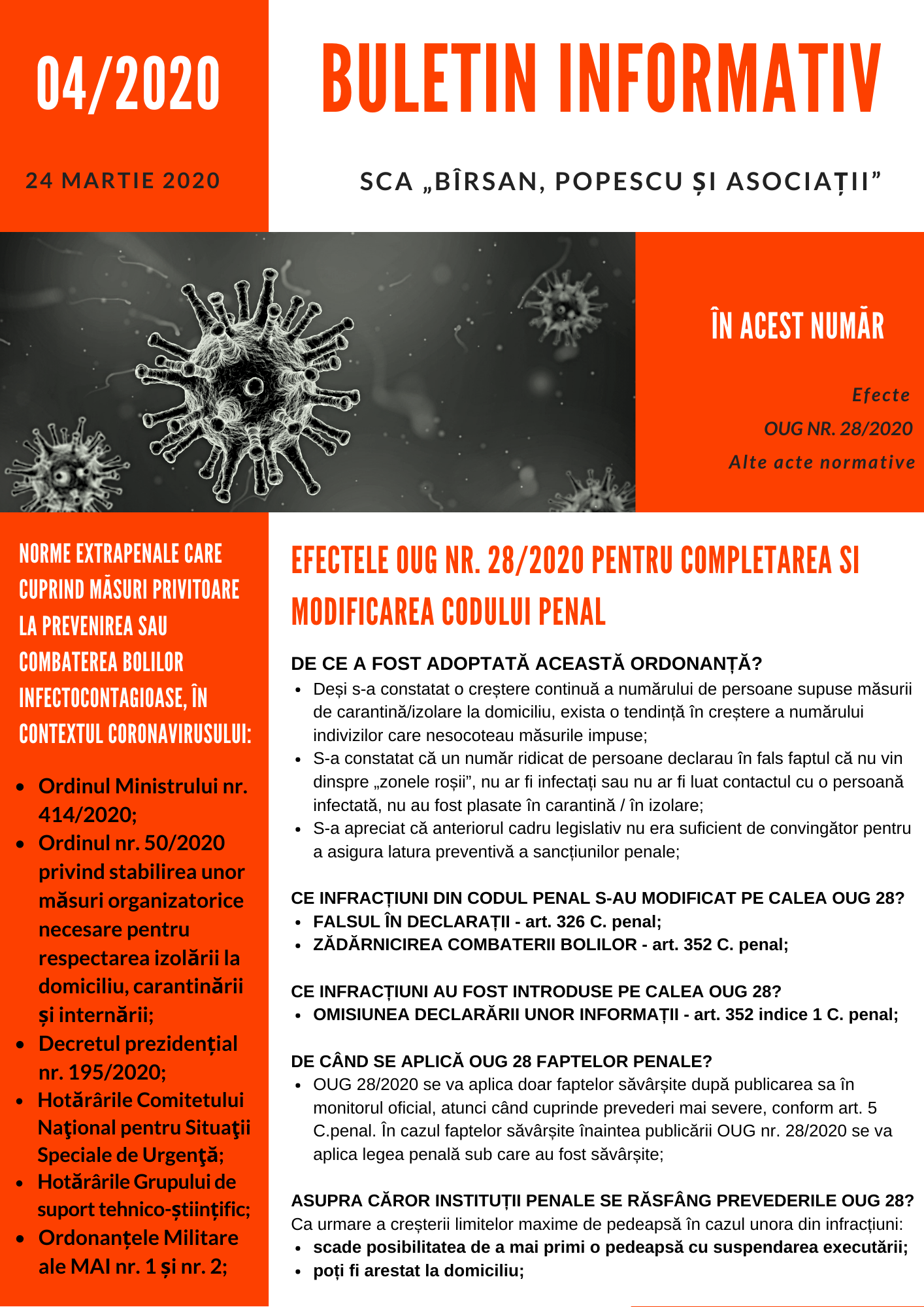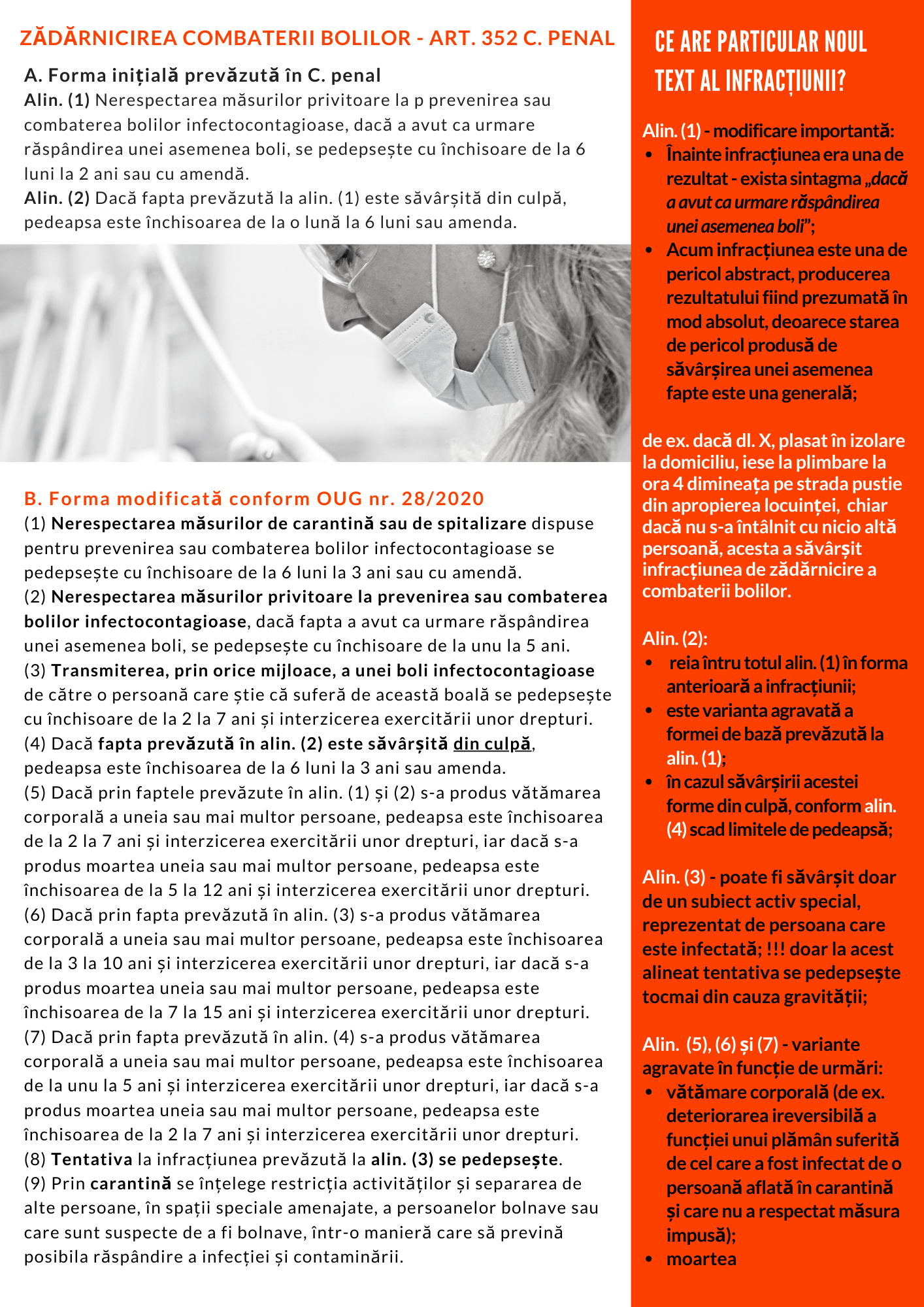 Evoluția epidemiei generată de COVID-19 și modului greșit în care o parte din cetățenii țării au înțeles să se raporteze la obligațiile care le revin în contextul acestei epidemii, Guvernul României a emis Ordonanța de Urgență nr. 28/20.03.2020 pentru modificarea și completarea Legii nr. 286/2009 privind Codul penal.