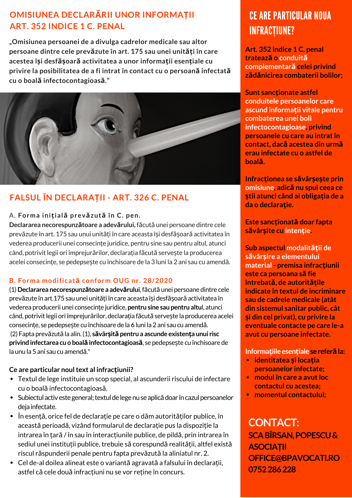 1.Modificarea și completarea conținutului infracțiunii de fals în declarații (art. 326 Cod penal) și a infracțiunii de zădărnicire a combaterii bolilor (art. 352 Cod penal) ;
