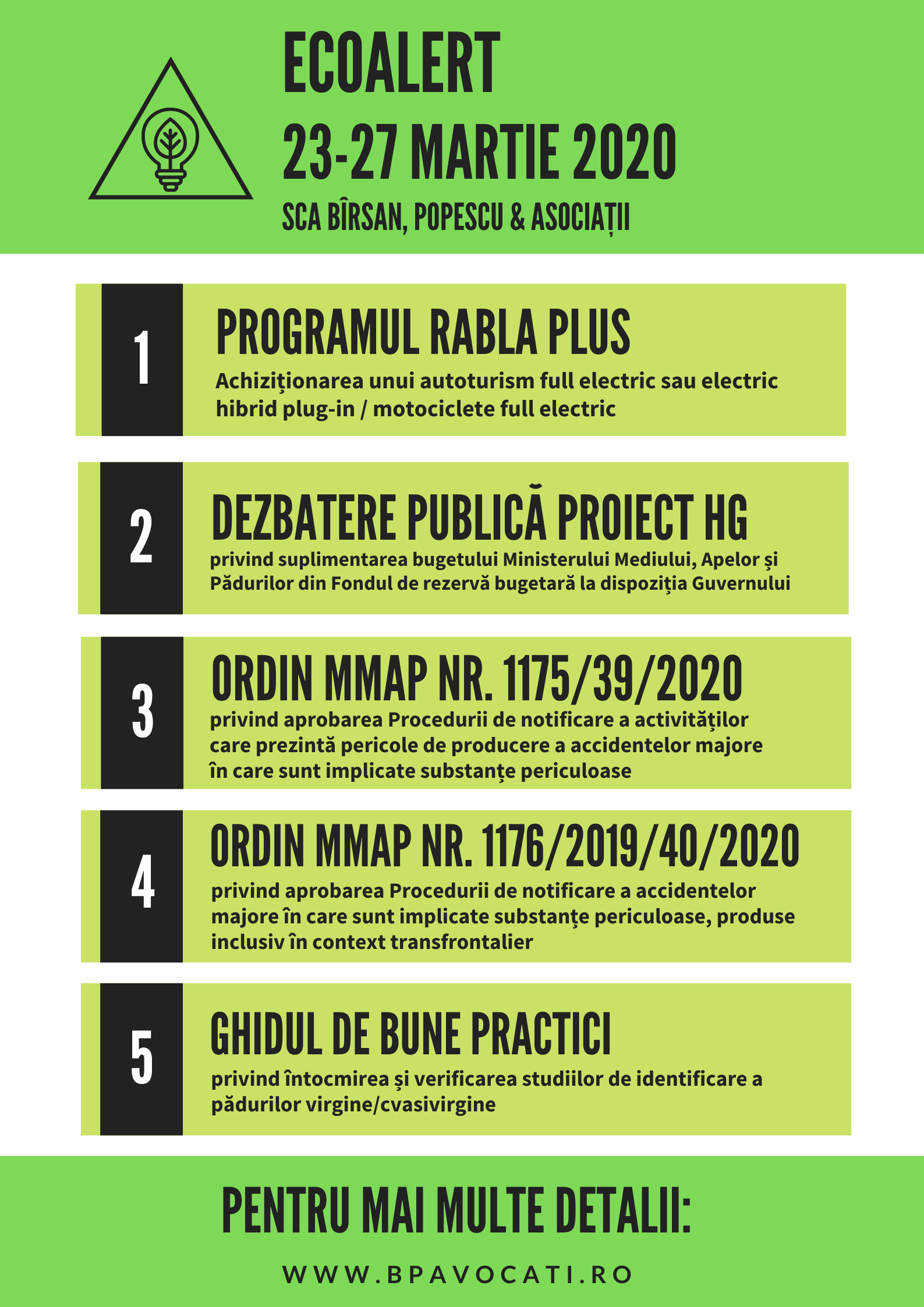 –înnoirea parcului auto prin programul „Rabla Plus”. Potrivit comunicatului de presă al MMAP (disponibil aici) „Programul de anul acesta păstrează pentru al cincilea an consecutiv cea mai mare primă pentru achiziția mașinilor full electric din Europa: circa 10.000 euro. În ceea ce privește achizițiile mașinilor hibrid plug-in, aceastea sunt susținute prin program cu circa 4500 de euro, iar motocicletele full electric cu peste 700 de euro, dar nu mai mult de 50% din costul autovehiculelor. ” Mai multe detalii, puteți regăsi pe pagina Administrației Fondului pentru Mediu dedicată programului „Rabla Plus”. Precizăm faptul că programul „Rabla Clasic” a demarat pe 17 martie 2020.